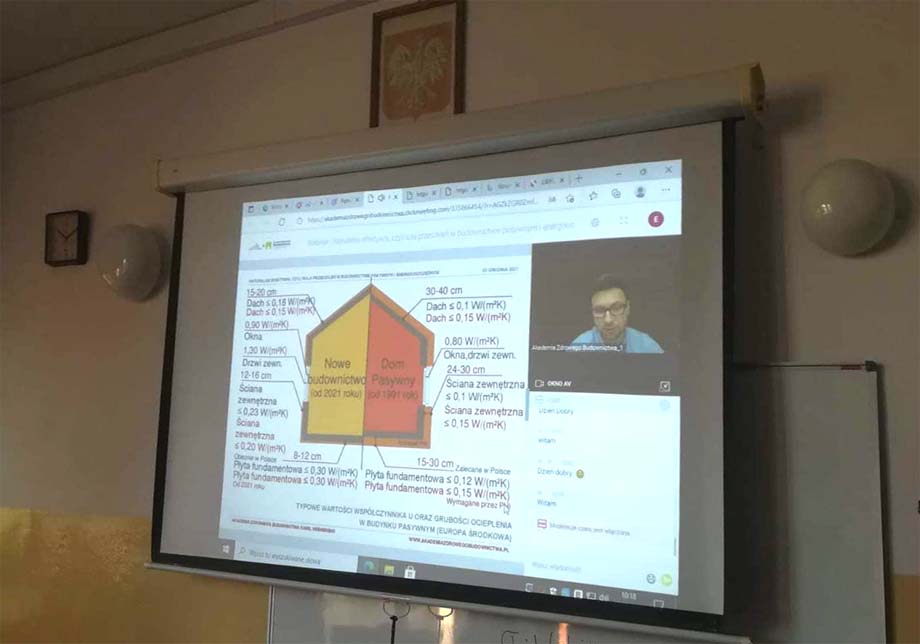 Podczas webinarium prowadzonym przez arch. Kamila Wiśniewskiego uczniowie zgłębiali tematykę roli budynków wysoce energooszczędnych i pasywnych w transformacji energetycznej, zmiany postrzegania i sposobu wyceny nieruchomości, a także waluty jaką będzie efektywność energetyczna budynków.